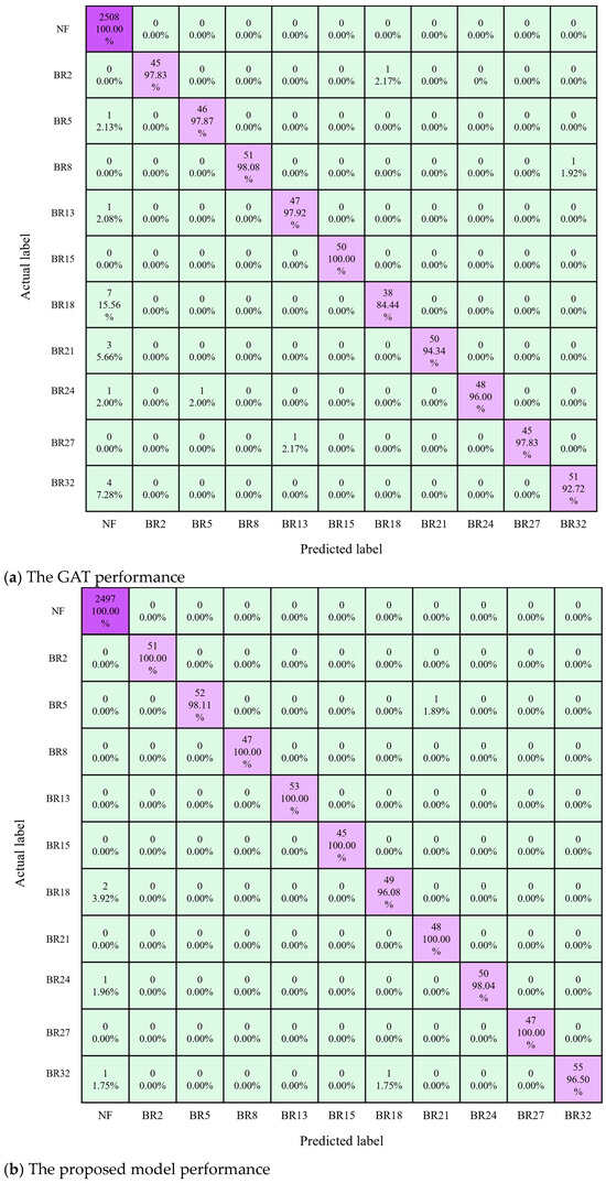 To evaluate the performance of the fault localization method proposed in this study, the confusion matrix and F1-score·were introduced for analysis. As shown in Figure 12, each row in the confusion matrix represents the true label of the data sample, and each column represents the predicted label obtained by the model classification. The sum of each row indicates the total number of samples in that class, the elements on the main diagonal indicate the number of samples correctly identified as belonging to that class, and the off-diagonal elements indicate the number of samples incorrectly predicted as belonging to other classes. These data can be used to determine whether the model exhibits confusion between certain classes. When dealing with imbalanced datasets, analyzing the confusion matrix can reveal whether the model overemphasizes or neglects minority classes, thereby providing a better understanding of the model’s actual performance. Figure 12a,b show the test performance of the GAT-based model and the model proposed in this paper, respectively. It can be observed that the model proposed in this paper, which employs a cost-sensitive loss function, enhances the model’s focus on fault samples, resulting in only a few fault branches being misclassified as non-fault branches.