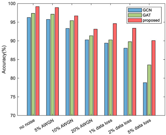 Considering that actual power measurement data may be subject to data disturbance, this section intends to use the same training dataset to test the anti-interference ability of the GCN, GAT, and the proposed cost-sensitive GAT (CS-GAT) model. Under the premise of a fault resistance of 100 Ω, 200 simulations were conducted for the non-fault condition and the fault condition of 10 branches to construct the equal proportion testing dataset. The stability of the model was verified by adding 60 dB and 30 dB Gaussian white noise to the testing dataset, and two data missing cases with random loss of 1% and 2% feature data. In particular, in the case of missing data, the lost data was filled with 0.