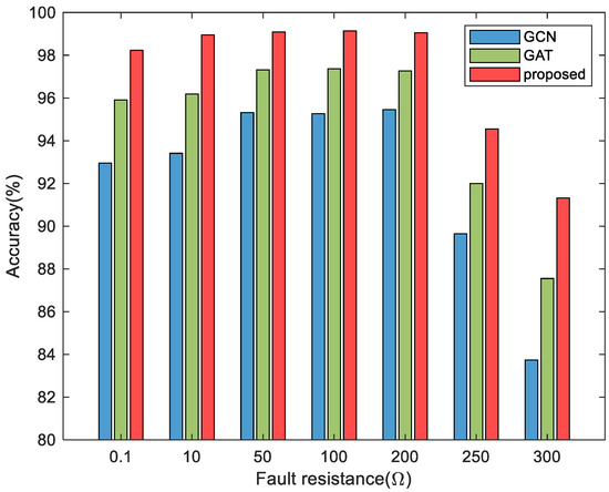 It can be seen that when the resistance value of the fault transition resistor is within the training range, all fault localization methods have high accuracy, but when it exceeds the training range, the fault localization accuracy decreases to varying degrees. Especially when the transition resistance is large, the fault characteristics are weaker and the difference between fault phase and non-fault phase is small, which seriously affects the performance of the fault location model. As shown in Figure 14, the positioning accuracy of the GCN is low, while the proposed model has stronger generalization ability. The proposed model still has a positioning accuracy of 91.32% when the fault resistance is 300 Ω. When the transition resistance is at a small value, due to the more obvious fault characteristics in the case of small resistance, the positioning accuracy of the three models decreases less.