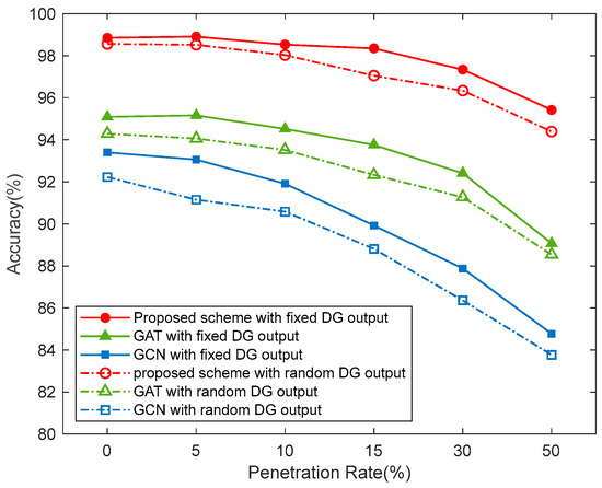 It can be observed that as the penetration rate of DGs in the distribution network increases, the fault voltage and current levels rise, making it easier to detect faults in the distribution network. At lower penetration rates, the proposed model demonstrates stable performance. However, when the penetration rate increases to 30% and 50%, the localization accuracy of all models shows a noticeable decline. This may be because the training dataset lacks fault data under high penetration conditions, causing the model to be less sensitive to the characteristics of grid faults under high penetration rates, thereby affecting the fault localization accuracy.