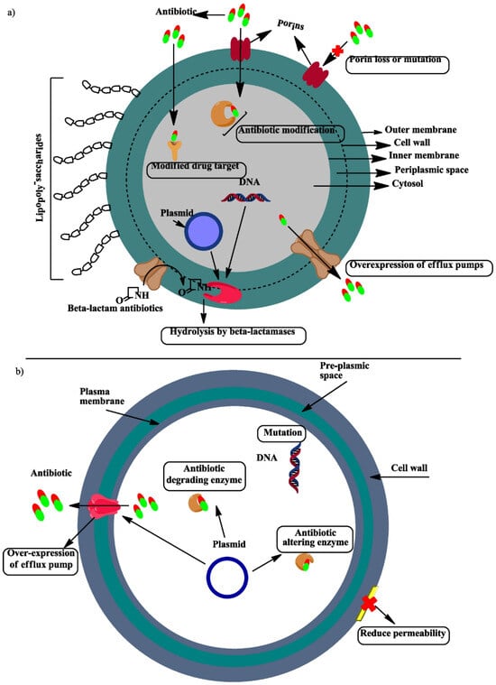 The structural component of bacteria cells shows multiple antibacterial resistance mechanisms. (a) Gram-positive bacteria and (b) Gram-negative bacteria. Reprinted from [4]. Copyright @ 2024, Springer Open.