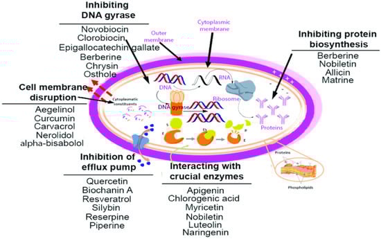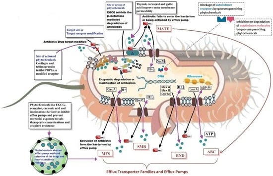 - Khameneh, B.; Eskin, N.M.; Iranshahy, M.; Fazly Bazzaz, B.S. Phytochemicals: A promising weapon in the arsenal against antibiotic-resistant bacteria. Antibiotics 2021, 10, 1044. [Google Scholar] [CrossRef] [PubMed]
