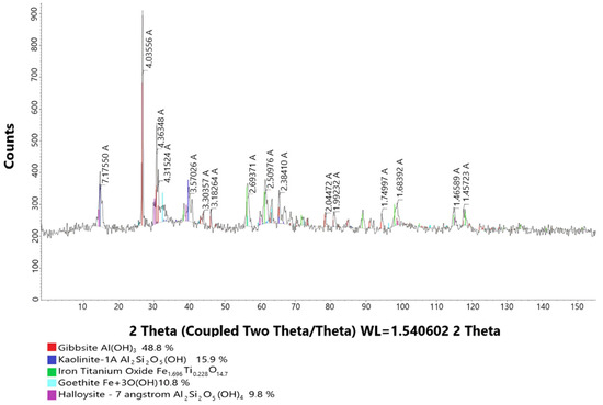 The X-Ray phase composition of the FKF suggests that the sample was composed of gibbsite, kaolinite, iron titanium oxide, goethite, and halloysite (Figure 1).
