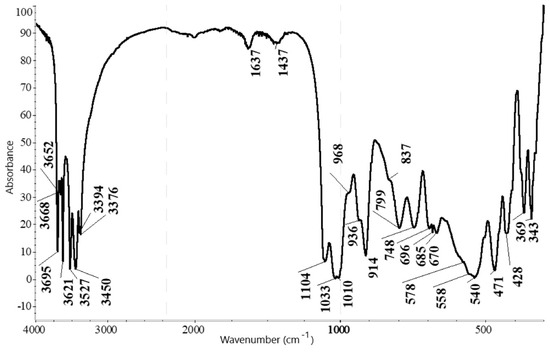 In the infrared spectrum of the original FKF sample, vibration modes at 3621, 3527, 3450, 3394, 3376, 1637, 1104, 1033, 968, 799, 748, 670, 558, 540, 471, and 428 cm−1 are characteristic of the gibbsite γAl(OH)3 phase; those at 3695,3668, 3652, 3621, 1637, 1104, 1033, 1010, 936, 914, 799, 696, 540, 471, and 428 cm−1 are characteristic of the kaolinite Al4[(OH)8|Si4O10] phase; those at 914, 799, 670, 578, 471, and 428 cm−1 are characteristic of the goethite α-FeOOH phase; those at 3695, 3621, 1637, 1104, 1033, 1010, 914, 696, 540, 471, and 428 cm−1 are characteristic of the halloysite Al4[(OH)8|Si4O10](H2O)4 phase; and those at 578 and 343 cm−1 are characteristic of the anatase TiO2 phase.