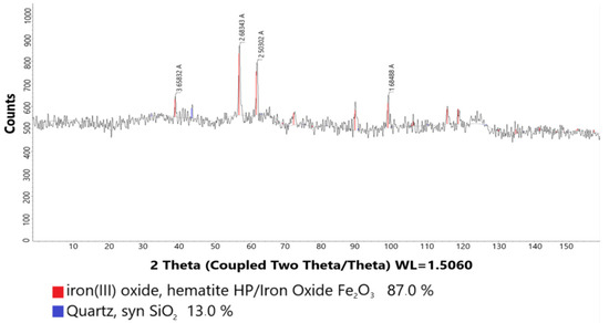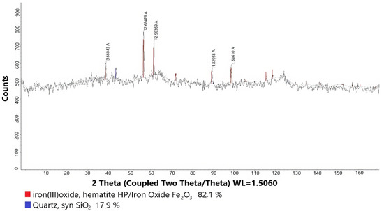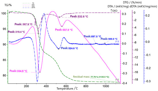 The study of the FKF using the thermal method of analysis (Figure 3) showed the presence of gibbsite, iron hydroxide, kaolinite, and coarse crystalline siderite. Intense endothermic effects with maximum development were recorded on the DTA curve at 334.5 °C, in which two minima appeared on the DTG curve (287.9 °C, 319.4 °C), which reflects the dehydration of gibbsite and iron hydroxide [24].