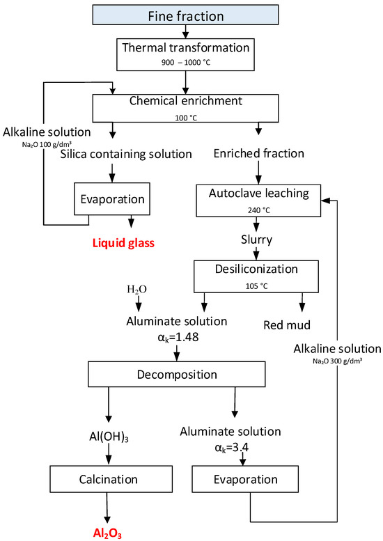 Selective processing for the FKF of high-silicon bauxite was carried out via various methods, including preliminary thermal transformation, chemical enrichment, autoclave leaching in a circulating aluminate solution, and low-temperature desiliconization, to obtain a decomposition solution (Figure 4).