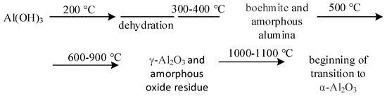 The purpose of conducting the preliminary thermochemical transformation was to produce a chemically stable aluminum-containing corundum phase, which prevents the transition of Al2O3 into an alkaline solution and ensures the maximum dissolution of amorphous SiO2 during the chemical enrichment of the FKF. The scheme of the thermochemical transformation of aluminum hydroxide during sintering is shown in Figure 5.