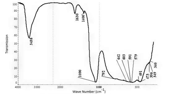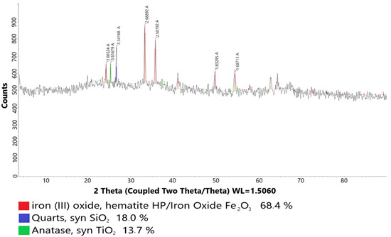 The infrared spectrum of the sample after preliminary sintering at a temperature of 1000 °C showed intense absorption in a range of 900–500 cm−1, with a maximum at 579 cm−1, which is characteristic of the amorphous aluminum oxide Al2O3 and the γ-Al2O3 phase. The peaks at 1090, 792, and 473 cm−1 are characteristic of SiO2. In addition to the peaks of Al2O3 and SiO2, fixed vibration modes at 591 and 473 cm−1 were observed and are characteristic of the presence of the oxide α-Fe2O3. The peak at 1400 cm−1 is characteristic of the [CO3]2 group. The peaks at 642, 603, and 579 cm−1 are characteristic of α-Al2O3. The peaks at 579 and 340 cm−1 are characteristic of anatase and TiO2.