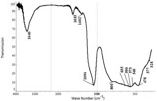 The infrared spectrum of the FKF sample after preliminary sintering at 900 °C showed intense absorption in a range of 900–500 cm−1, with a maximum at 573 cm−1, which is characteristic of amorphous aluminum oxide (Al2O3) and the γ-Al2O3 phase. The peaks at 1094, 800, and 478 cm−1 are characteristic of SiO2. In addition to the intense absorption of the oxides Al2O3 and SiO2, vibration modes at 590, 540, 478, 377, and 328 cm−1 were recorded, which are characteristic of the iron oxide α-Fe2O3 phase. The peak at 1402 cm−1 is characteristic of the [CO3]2– group, and those at 635 and 573 cm−1 are characteristic of corundum Al2O3. The absorption band at 492 cm−1 falls into the region where AlO6 polyhedra appear.