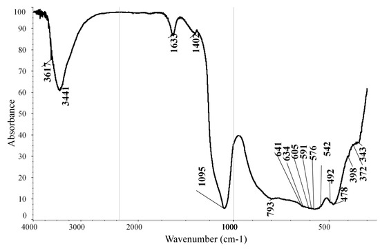 The weak band at 3617 cm−1 corresponds to the hydroxyl groups of kaolinite Al4[(OH)8|Si4O10], which are directed toward octahedral vacancies. The spectrum does not contain a band of stretching vibrations associated with interlayered hydroxyl groups in kaolinite, with a maximum near 3698 cm−1 [5]. The absorption band at 492 cm−1 corresponds to AlO6 polyhedra.