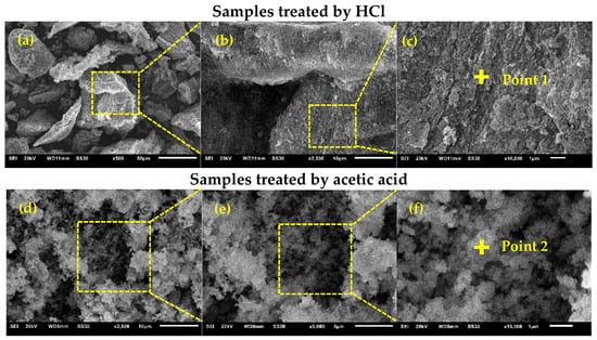 SEM images of a sample treated by HCl and acetic acid. (a) The 500× SEM image of the sample treated by HCl; (b) 2500× SEM image of the sample treated by HCl; (c) 10,000× SEM image of the sample treated by HCl; (d) 500× SEM image of the sample treated by AA; (e) 5000× SEM image of the samples treated by AA; (f) 15,000× SEM image of the sample treated by AA; (g) EDX spectrum of Point 1; (h) EDX spectrum of Point 2.