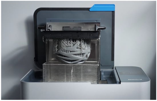 The initial stage of post-processing involves the cleaning process. The printed object is carefully removed from the build platform and thoroughly cleaned to remove any remaining liquid resin. Typically, this is accomplished by immersing the object in a bath of isopropyl alcohol (IPA) or using ultrasonic cleaners. These techniques guarantee the complete removal of any uncured resin from both the surface and intricate parts of the product, thus preparing it for the next steps [56]. Figure 3 illustrates an isopropyl alcohol (IPA) bath apparatus, with the 3D-printed object visible as it is drawn through the apparatus [57].