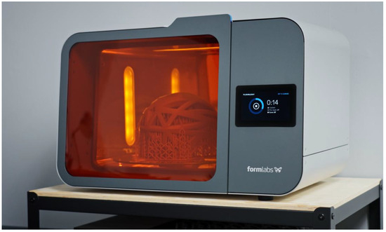 Final light curing is an essential process in which the object, after being cleaned and dried, is placed inside a UV curing chamber. The purpose of this chamber is to subject the object to additional ultraviolet (UV) radiation, thereby completing the resin polymerization process. This phase is critical to improve the mechanical properties, strength and stability of the final product. The use of UV radiation guarantees complete solidification of any residual liquid resin within the product, thus enhancing its overall strength and performance [56,58]. Figure 4 illustrates a final photopolymerization chamber apparatus using UV rays, with the 3D-printed object visible through the apparatus [56].