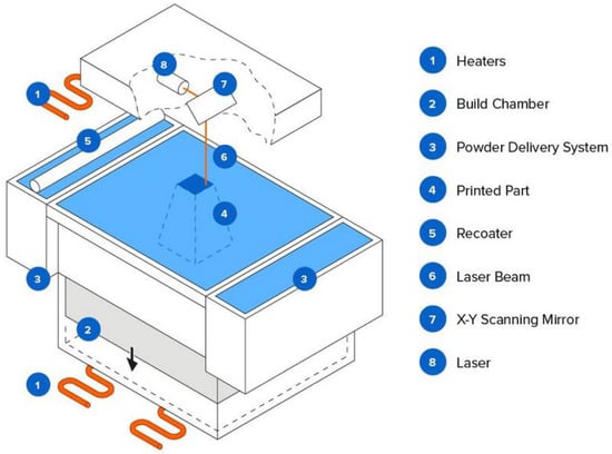 Basic components that make up a selective laser sintering (SLS) 3D printer [61].