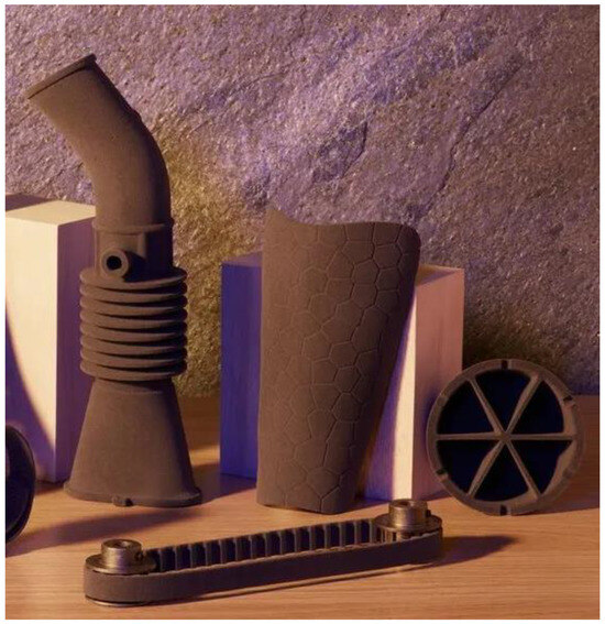 An advantage of selective laser sintering (SLS) is its ability to manufacture compo-nents with excellent mechanical properties. High temperatures and precise laser manipulation facilitate strong adhesion between layers, yielding components with exceptional strength and longevity. In addition, the powder that has not been sintered can be recycled and reused, resulting in a more economical and environmentally friendly process [60]. Figure 7 depicts objects made with a selective laser sintering 3D printer [62]. Characteristic is the slightly grainy surface finish, with hardly any visible layer lines. It is recommended to use post-treatment methods such as sandblasting to achieve a smoother final finish.