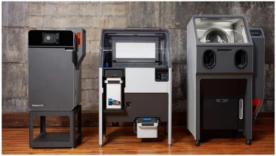 The additional cleaning of components is often required to remove any remaining microscopic particles. Ultrasonic or high-pressure air cleaners are often used to effectively remove any remaining particles, especially from complex shapes and internal passages. Surface finishing processes are then used to improve the visual aesthetics and surface characteristics of SLS parts. One of the processes commonly used for surface treatment is sandblasting. Sandblasting involves the use of a high-pressure stream of abrasive material to smooth the surface and eliminate any residual dust [63]. Figure 8 shows a complete setup of a selective laser sintering 3D printer along with post-processing devices.