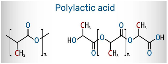 One of the main factors contributing to the widespread use of PLA in 3D printing is its user-friendly nature. Polylactic acid (PLA) exhibits a very moderate melting point, typically ranging from 180 to 220 °C, facilitating a seamless and uniform extrusion process. The lowered melting point also reduces the chance of distortion, a common problem in 3D printing, especially when dealing with complex geometries and sharp edges. The material’s minimal coefficient of thermal expansion enhances its stability during the printing process, ensuring that the pieces maintain their defined dimensions [65]. In addition, when subjected to heat, PLA emits a soft and pleasant aroma, which is significantly less dangerous compared to the particles emitted by other types of plastics. This feature makes PLA a safer choice for both home and educational environments [65]. Figure 9 illustrates the chemical formula of PLA.