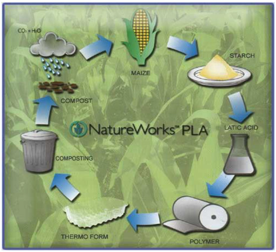 Schematic illustration of the manufacturing process of PLA, up to its final composting [67].