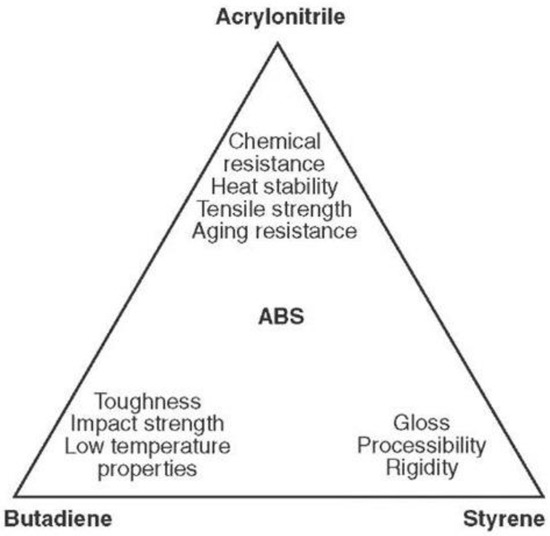 ABS, short for Acrylonitrile Butadiene Styrene, is a thermoplastic polymer widely used in the field of 3D printing. This material is synthesized through the polymerization of three distinct monomers: acrylonitrile, butadiene, and styrene. Each of these components imparts distinct characteristics to the final product: acrylonitrile contributes to chemical resistance, hardness, thermal stability and aging resistance; butadiene enhances hardness and impact resistance and contributes to achieving the desired properties at low temperatures; and styrene imparts rigidity and gloss and facilitates the construction of the material [52]. Figure 11 shows a schematic representation of the three aforementioned monomers required for the synthesis of the ABS material.