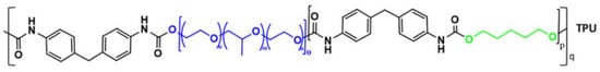 Thermoplastic polyurethane (TPU) is created by polymerizing diisocyanates and polyols, which leads to the creation of elongated molecules with alternating stiff and flexible segments. The production of TPU commences with the fabrication of two primary components: diisocyanates, which contribute to the formation of rigid components, and polyols, which generate the flexible components. Methylene diphenyl diisocyanate (MDI) and toluene diisocyanate (TDI) are frequently utilized diisocyanates. Polyols are often based on polyester or polyether materials [85].