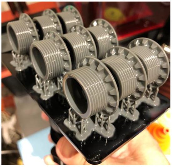 ABS also offers the advantage of easy post-processing. ABS parts may be subjected to grinding, drilling and machining processes, allowing for flexibility in cleaning and customizing printed products. Additionally, ABS can be made smoother using acetone vapor, making it easier to achieve a polished and professional appearance [71]. Figure 12 shows ABS components after exposure to acetone vapors, giving them a characteristic gloss compared to their original “matte” finish [72].