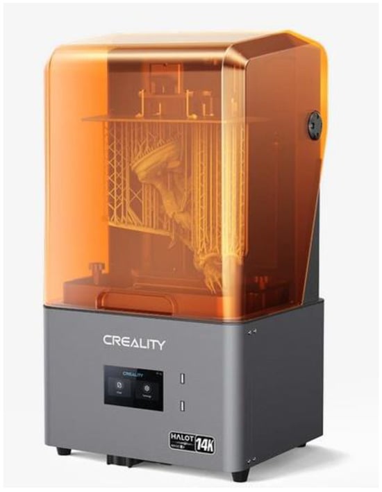 A selective laser sintering (SLS) machine includes basic components such as a control computer, a fabrication chamber, a powder supply system, a repainting mechanism, and a high-power laser. Inside the build chamber, there is a vertically moving platform that adjusts to facilitate the creation of each successive layer. The process begins by evenly spreading a thin layer of powder on the build platform using a repainting tool such as a roller or blade. A high-powered CO2 laser is used to scan the surface and selectively sinter (heat and fuse) the powder particles together based on the CAD data. The laser trajectory is adjusted with high precision to selectively liquefy the powder exclusively within the defined areas, resulting in the formation of a cohesive layer. The adjacent powder remains unconsolidated, providing reinforcement to the frame and avoiding the need for additional support elements [60]. Figure 6 shows a desktop 3D stereolithography printer. A special feature is the color removable protection cap, which ensures that the liquid light-curing resin is not polymerized by ambient light when the 3D printer is not in use [61].