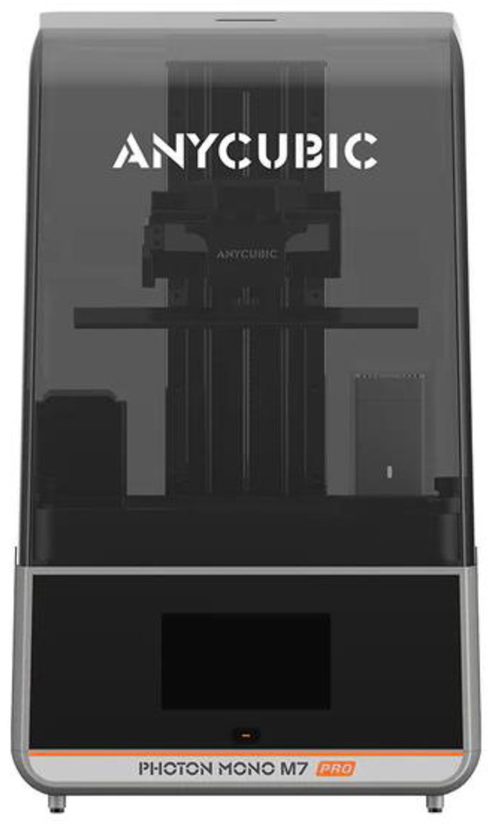 - Anycubic 3D Printer. Available online: https://www.anycubic.com/en/photon-m7-pro (accessed on 17 July 2024).