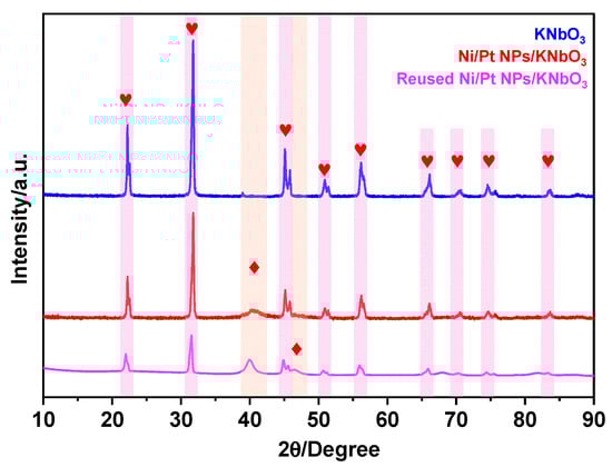 X-ray diffractograms for KNbO3 and Ni1Pt3 NPs/KNbO3. Caption:♥ KNbO3 orthorhombic phase (pink color) and ♦Pt (orange color). Orthorhombic KNbO3 pattern: JCPDS Card 32-0822 and Pt pattern: JCPDS Card 04-0802.