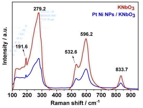 Figure 2 shows the Raman spectra for KNbO3 and Ni1Pt3 NPs/KNbO3. KNbO3 presented characteristic peaks around 193, 280, 530, 596, and 834 cm−1. The minimum formula of potassium niobate is KNbO3, which crystallizes in an orthorhombic crystal structure. In this structure, the NbO6 octahedra are formed, with potassium ions occupying the interstitial spaces. The bands at 190 and 280 cm−1 are due to the internal vibration modes and bending modes of the NbO6 octahedra, respectively. The peaks at 528 and 592 cm−1 are due to the stretching modes of NbO6. All Raman signals between 100 and 1000 cm−1 are due to the NbO6 octahedra [42]. For Ni1Pt3 NPs/KNbO3, no shift in the peaks is observed, only a decrease in their intensities. This result may be attributed to the presence of Pt nanoparticles, which blind the Raman signal of KNbO3, thereby enabling an indirect verification of the existence of these species. Similar results were observed by Zhang et al., who synthesized KNbO3 modified with nickel sulfide [43].