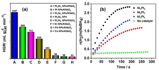It was observed that the bimetallic composition (Ni:Pt) exhibited better catalytic performance compared to the monometallic catalysts, except for Ni3Pt1. In this case, the higher nickel content may have saturated the platinum catalytic sites, leading to reduced efficiency of the nanocatalyst. The highest catalytic activity was achieved with Ni1Pt3/KNbO3. The hydrogen generation rates (HGR) were calculated and are presented in Figure 4a. For Ni1Pt3/KNbO3, an HGR of 1257 mL g−1cat min−1 was obtained, surpassing the values for both Pt and Ni nanoparticles. This enhancement for the Ni/Pt nanoparticles can be attributed to a synergistic effect between nickel and platinum [45]. The electronic interaction within the bimetallic system, due to differences in electronegativity, facilitates electron transfer from Ni to Pt. This electron transfer disrupts the uniformity of the electronic distribution on the surface of the Ni/Pt NPs, leading to increased adsorption capacity and, consequently, enhanced catalytic activity [46].