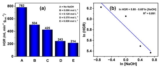 Typically, the addition of NaOH stabilizes NaBH4 solutions against spontaneous autohydrolysis. This effect on catalytic performance was evaluated using various NaOH concentrations (0.006, 0.120, 0.370, and 0.500 mol L−1). As shown in Figure 5a, H2 evolution was more efficient in the absence of NaOH, as indicated by the HGR values. Increasing NaOH concentration resulted in a reduced HGR under the evaluated conditions. Al-Shaikh et al. [23] reported a similar negative impact of NaOH when employing Pt NPs as catalysts for NaBH4 hydrolysis. This was attributed to the high electron density on the Pt NPs surface, where OH− ions compete with substrate molecules for active sites, thereby reducing catalytic activity.