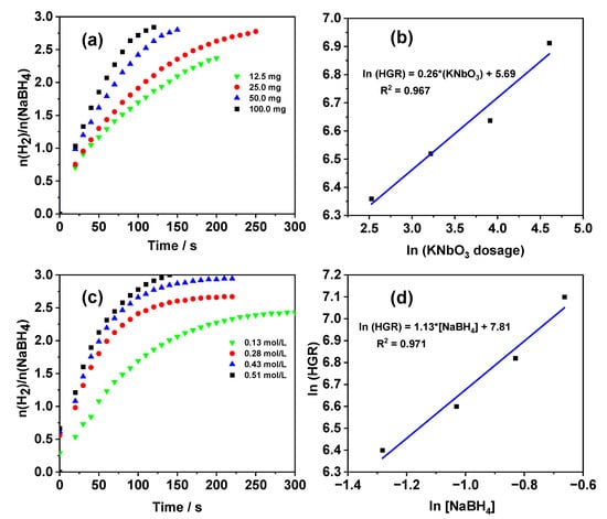 Evaluation of the effect of KNbO3 dosage (a,b) and initial NaBH4 concentration (c,d) on H2 evolution from NaBH4 hydrolysis. Reaction conditions: 6.89 mmol% of the catalyst (Ni1Pt3) in relation to NaBH4; 295.15 K.