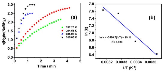 Effect of temperature on the H2 generation from NaBH4 hydrolysis. Reaction conditions: (a) 1.0 mL of NaBH4 (0.50 mol L−1); 6.89 mmol% of catalyst (Ni1Pt3) relative to NaBH4; KNbO3 (25.0 mg); (b) Arrhenius plot.