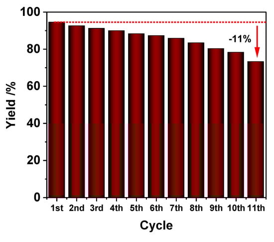Recyclability is a critical parameter for evaluating the stability of heterogeneous catalysts. Therefore, the Ni1Pt3/KNbO3 nanomaterial was assessed in two different assays: durability, which involves reintroducing NaBH4 into the system without washing the catalyst, and reuse, which includes a washing step between cycles. Figure 8 shows the durability results. It can be observed that there was only an 11% loss in efficiency between the first and eleventh cycles. The decrease in HGR over the cycles can be attributed to the precipitation of NaBO2, which blocks the catalyst’s active sites [37].