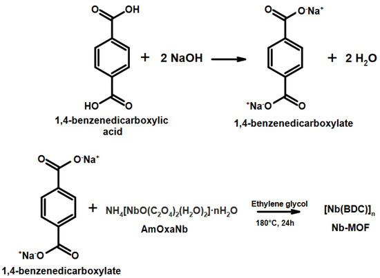 General scheme illustrating the synthesis process of the niobium-based metal–organic framework. AmOxaNb represents niobium ammoniacal oxalate, and Nb-MOF represents the niobium-based metal–organic framework [Nb(BDC)]n.