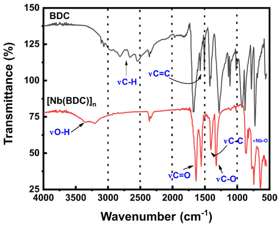 The success of the synthesis of Nb-MOF was confirmed by FT-IR spectroscopy, which also detailed the presence of functional groups in the [Nb(BDC)]n material. Figure 2 shows the FT-IR spectra of both the synthesized MOF and the ligand (BDC). Significant shifts in the absorption bands around 500 cm−1 likely indicate the stretching and bending modes associated with the Nb–O bonds [5]. Furthermore, the shifts in the peaks at 1104 cm−1 and 1250 cm−1 can be attributed to the stretching vibrations of the C–O and C–C bonds, respectively [19]. The deformation of the bands between 1750 cm−1 and 1500 cm−1 in the as-synthesized compound suggests deprotonation of the –COOH group, supporting the formation of the MOF as the metal center binds to these negatively charged sites [5,19]. The broad band observed at 3400 cm−1 can be attributed to the surface-absorbed water and hydroxyl groups within the [Nb(BDC)]n structure [20]. When comparing the spectra of the synthesized Nb-MOF with that of the BDC ligand, a remarkable broadening of the band associated with the Nb-MOF is observed. This broadening suggests subtle interactions between the ligand and the metal, reflected not only in a shift in frequency but also in significant changes in the shape and width of the band. These modifications suggest coordination between the metal center and the ligand.