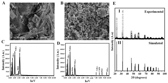 Image of morphology of (A) Nb-MOF and (B) Nb-MOF/Pt–Co. Energy dispersive spectroscopy spectra for (C) Nb-MOF and (D) Nb-MOF/Pt–Co. (E) X-ray diffraction pattern for [Nb(BDC)]n: (I) obtained experimentally and (II) found in the X-ray diffractometer processor database (ICSD 028564).