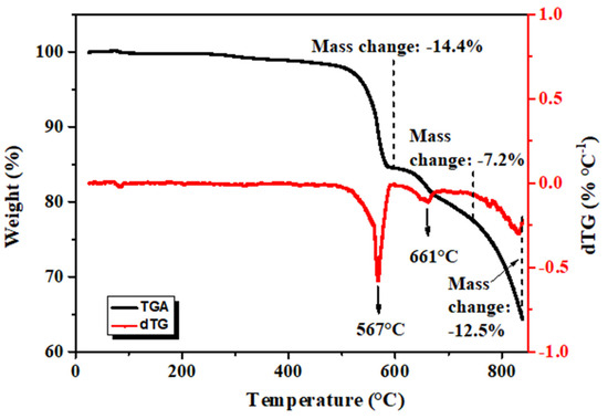 The thermal stability of the synthesized compound was also assessed using thermogravimetric analysis. The resulting thermogram, presented in Figure 4, shows three notable mass loss events. The first event, with a mass loss of 14.4%, occurs at 567 °C, which is attributed to the initial decomposition of the BDC ligands. The second event, involving a mass loss of 7.2%, occurs at 661 °C, likely indicating the further loss of BDC residues. Above 800 °C, the remaining mass loss is associated with the decomposition of other MOF byproducts.