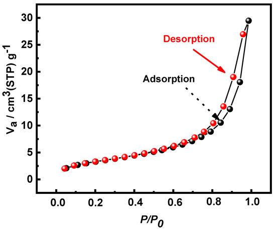 To examine the pore size distribution, surface area, porosity type, and total pore volume of [Nb(BDC)]n, the BET method was employed. Nitrogen adsorption–desorption isotherms were obtained at 77 K to assess the material specific surface area, with the pore characteristics being calculated based on the BET model. The N2 adsorption–desorption curves shown in Figure 5 indicate that [Nb(BDC)]n follows a type III isotherm. From the BET data, the MOF surface area and total pore volume were determined to be 1200 m2 g−1 and 0.0454 cm3 g−1, respectively. The average pore size, calculated at 6.42 nm, confirmed the microporous nature of the synthesized material.