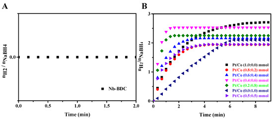 Hydrogen evolution from NaBH4 using (A) Nb-MOF and (B) using different ratios of bimetallic Pt–Co compositions. Reaction conditions: 50.0 mg of the Nb-MOF, 1.0 mL of NaBH4 (0.5 mol L−1), continuous stirring at 300 rpm, and a temperature of 298.15 K.