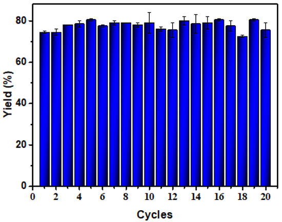 To assess the efficiency of the catalyst, it is fundamental to evaluate its stability and durability. Therefore, the durability of Nb-MOF/Pt0.4–Co0.6 was tested through catalyst cyclization experiments. The catalyst was reused for 20 cycles under optimal conditions. After each cycle, a fresh NaBH4 solution was reinjected into the system after a 5 min interval with the system open, ensuring complete dissipation of any residual H2 gas. The results are presented in Figure 7; the catalyst maintained its efficiency throughout the cycles, consistently achieving the same yield with an average reaction time of approximately 60 s. These findings confirm the durability and sustained efficiency of the catalyst over multiple uses.