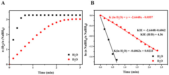 The kinetic isotope effect (KIE) is an important tool for investigating the reaction mechanism, indicating the rate-determining step of the reaction [26]. KIEs can be classified as primary (with values between 2 and 7) or secondary (with values between 0.7 and 1.5) [27]. A primary KIE suggests that the reaction involving the isotopically labeled atom is the rate-determining step, whereas a secondary KIE indicates additional complexity in identifying the rate-determining step [28,29]. The KIE for Nb-MOF/Pt0.4–Co0.6 was evaluated. The results are shown in Figure 8. H2 evolution using H2O and D2O is illustrated in Figure 8A, while linear regression indicating the KIE of the reaction is shown in Figure 8B. A KIE of 4.36 was obtained, indicating that the dissociation of O–H/O–D from H2O/D2O is affected by the reaction. This also suggests that the step involving water is the rate-determining one in the process.