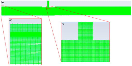 Concerning the spatial discretization in the device region, square cells of size m were used, as indicated by [23,55]. Thus, Figure 5a presents the mesh adopted for the computational domain in the present study. Additionally, detailed views of the mesh are shown in Figure 5b, focusing on the beginning of the wave channel, where the regions of the stretched mesh can be observed, and Figure 5c, focusing on the OWC WEC region, which shows greater refinement.
