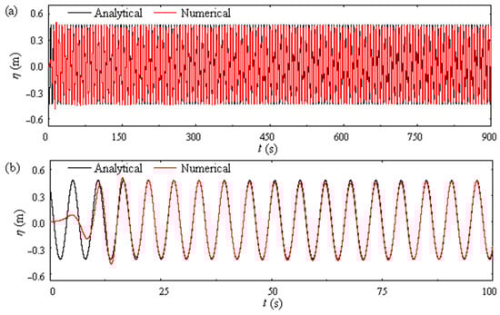 The first results to be presented are those used to verify the numerical model employed. Figure 6 presents the qualitative comparison between the free surface elevation obtained using Fluent software and the results from the analytical solution. In this sense, in Figure 6a, one can observe the total simulation time (900 s). In Figure 6b, the first 100 s are highlighted, aiming to allow a better visualization of the results.