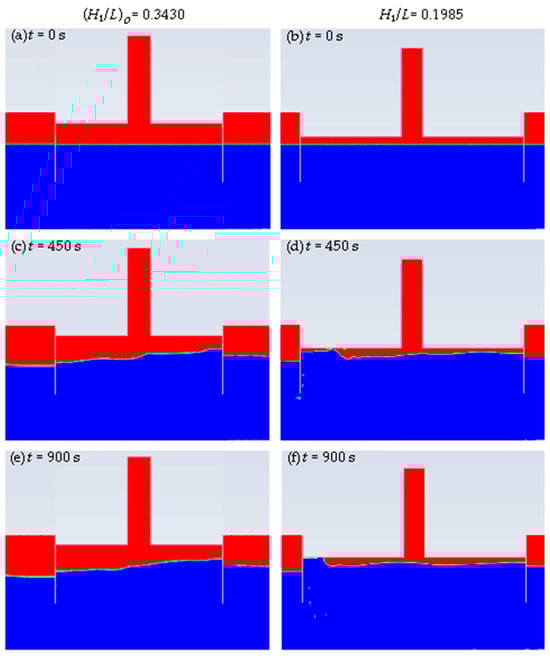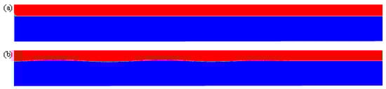 Finally, in order to enable the visualization of the physical phenomenon, i.e., the generation and propagation of representative regular waves, the volume fraction field is shown in Figure 7. The water phase is represented by the color blue, while the air phase is represented by the color red. Thus, the fluid dynamic behavior in the numerical wave channel is presented, both for the beginning and for the end of the simulation in Figure 7a, at s, and in Figure 7b, at s, respectively.