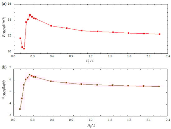 As mentioned, the present study employed the constructal design method in order to perform a geometric evaluation of the OWC WEC, aiming to define the geometry that provides the best performance. In this sense, the results monitored at the center of the air duct are presented in Figure 8 and include: (a) the pressure () and (b) the mass flow (). It should be emphasized that the RMS metric was used to analyze these parameters as the degree of freedom varies.