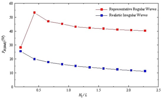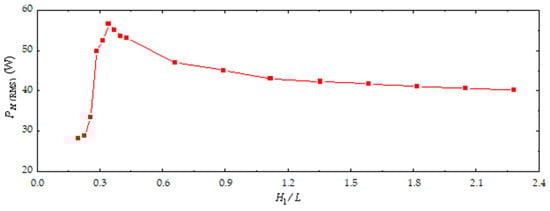 With the variations in , it was possible to identify the best geometric configuration for the OWC device subject to the representative regular waves of the sea state that occurred in the municipality of Tramandaí. For this purpose, the performance of the device was evaluated according to the available hydropneumatic power (), calculated using the following equation [64]:
