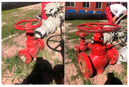 As shown in Figure 2, the valve seals of a long-distance natural gas station were investigated on-site, and after communicating with field personnel and collecting material accounts, it can be seen that the types of non-metallic seals of the long-distance pipeline mainly include fluorine rubber, nitrile rubber, nylon, graphite-polytetrafluoroethylene, and other materials. Combined with the field application situation and application prospect of each material, fluorine rubber, nitrile rubber, nylon, graphite-polytetrafluoroethylene, and para-polystyrene-polytetrafluoroethylene, five types of materials were selected [29,30,31,32,33]. In order to analyze the sealing performance, aging performance, and anti-explosion performance of different non-metallic seals under hydrogen-doped conditions, hydrogen-doped sealing tests, hydrogen-doped aging tests, and hydrogen-doped anti-explosion tests were carried out, respectively, under the conditions of no hydrogen and 5% hydrogen-doped conditions.