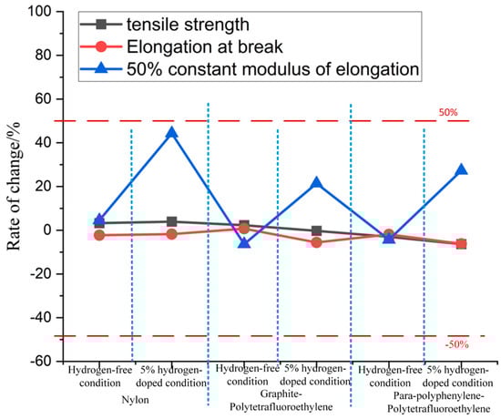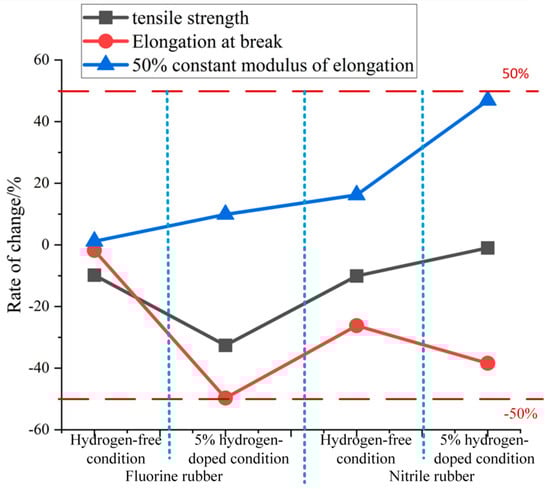 According to the GB/T 34903.2-2017 standard requirements for different materials, non-metallic seals were subjected to a hydrogen-doped aging test, and the test results are shown in Figure 3 and Figure 4 [39,40,41]. The sample shape is a dumbbell spline, the thickness is 2 mm, the standard distance is 25 mm, and the length is 75 mm. According to the standard requirements, rubber performance requirements for tensile properties include a change rate of ±50% [modulus of elasticity (50% or 100% elongation), tensile strength, elongation at break] and hardness of +10/−20 units (initial nominal hardness of 90 +5/−20 units) for Shore A and IRHD. The plastic performance requirements for tensile properties include a change rate of ±50% [modulus of elasticity (50% or 100% elongation), tensile strength, and elongation at break]. The results of hydrogen-doped aging tests for the five types of materials are shown in Figure 2 and Figure 3, respectively. Among the soft seals, the maximum change rate of the fluorine rubber index is 48.8%, the maximum change rate of the nitrile rubber index is 46.9%, and the maximum change rate of the two is similar; among the hard seals, the maximum change rate of nylon is 38%, the maximum change rate of graphite-PTFE is 21.4%, the maximum change rate of para-polyphenyl-polytetrafluoroethylene is 27.3%, and it can be seen that the maximum change rate of graphite-PTFE is the minimum.