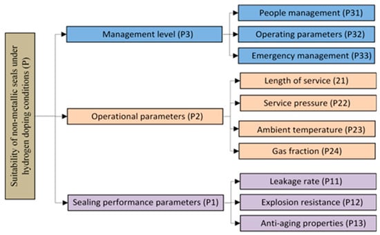 This paper constructs an applicability assessment index system for non-metallic seals under hydrogen-doped conditions from three aspects: sealing reasons, environmental reasons, and human reasons. The evaluation index system includes 3 second-level evaluation indexes and 10 third-level evaluation indexes. The second-level indexes include the sealing performance of non-metallic seals P1, operation parameters P2, and management level P3, and the content of the specific index system is shown in Figure 5.